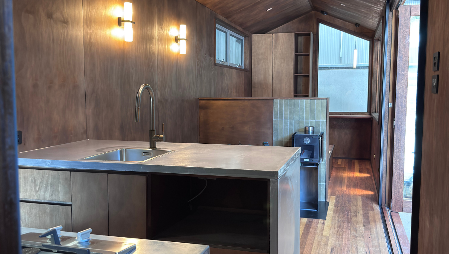 Built for remote properties, off-grid escapes, and serious bush retreats — the Outback Fig is the most characterful cabin in the Big Fig range. Zinc external cladding and hardwood-framed doors and windows give it a raw, working Australia exterior, while the interior tells a different story — timber-lined walls, hardwood floors, concrete benchtops, and warm wall lighting create something that feels more boutique bush lodge than tiny home. This one's for people who want something with soul.